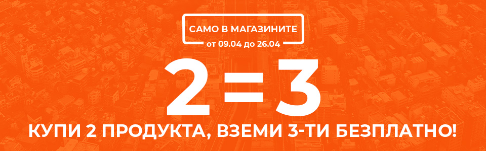 - При покупка на 2 артикула, получаваш 3-ти безплатно. Безплатен е артикулът с най-ниска стойност. Крайната отстъпка се начислява пропорционално на трите артикула.